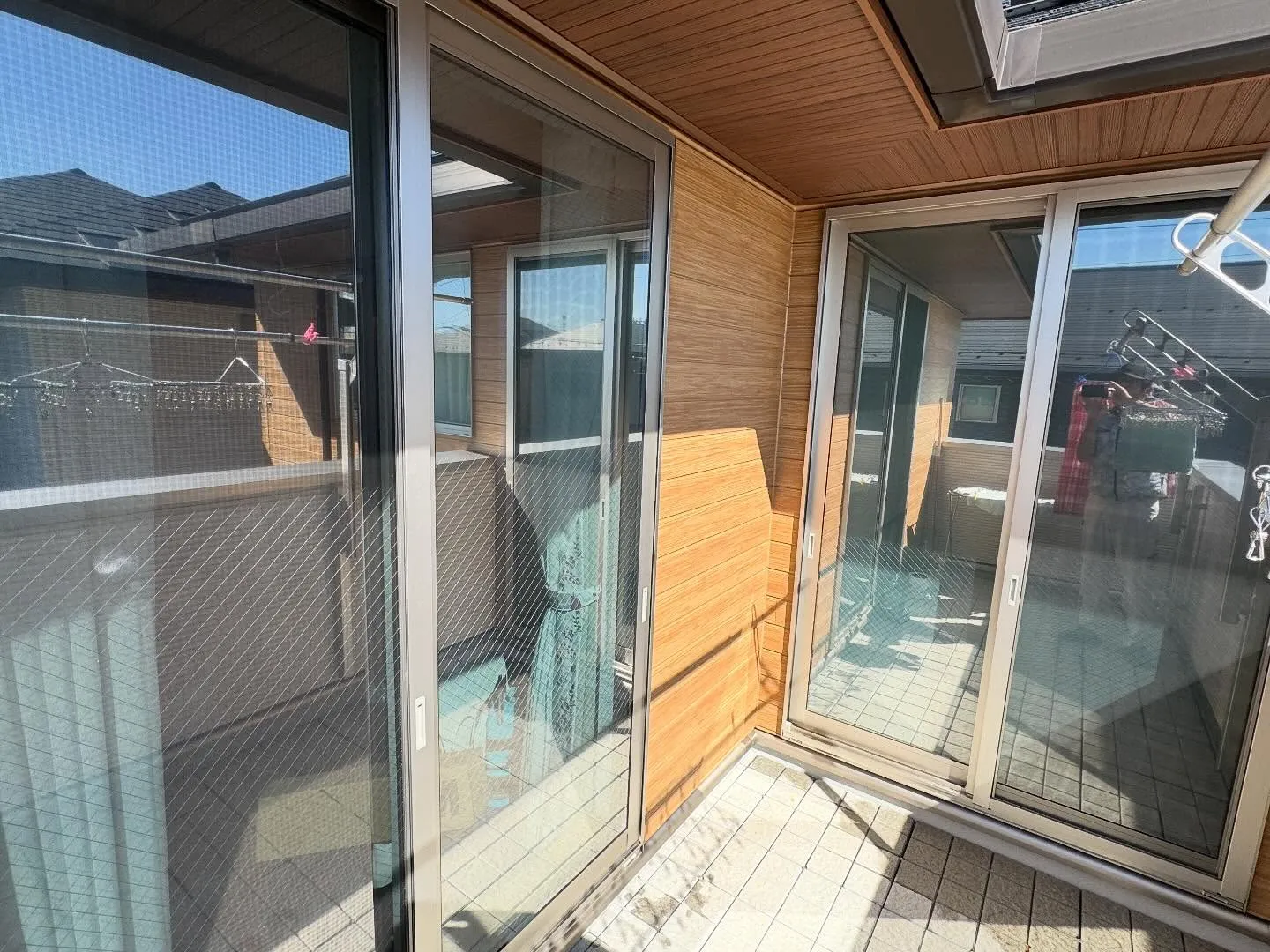 所沢市の新築一戸建てへ先日の防犯フィルム施工に加えて追加でベランダに面している2箇所の掃き出し窓へ遮熱及び目隠し目的でシルバー遮熱(ミラー目隠し)フィルム タクミ製RSP35EXを施工しています。