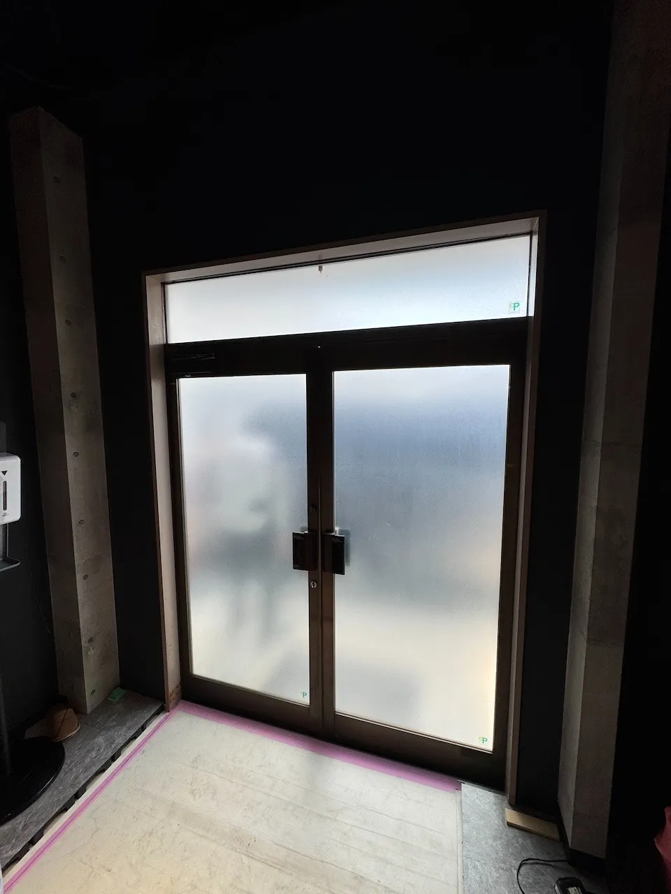 出入りの多いエントランスドアへやや透け感のあるマットタイプの防犯フィルム 3M 防犯フィルム マットを施工しています。