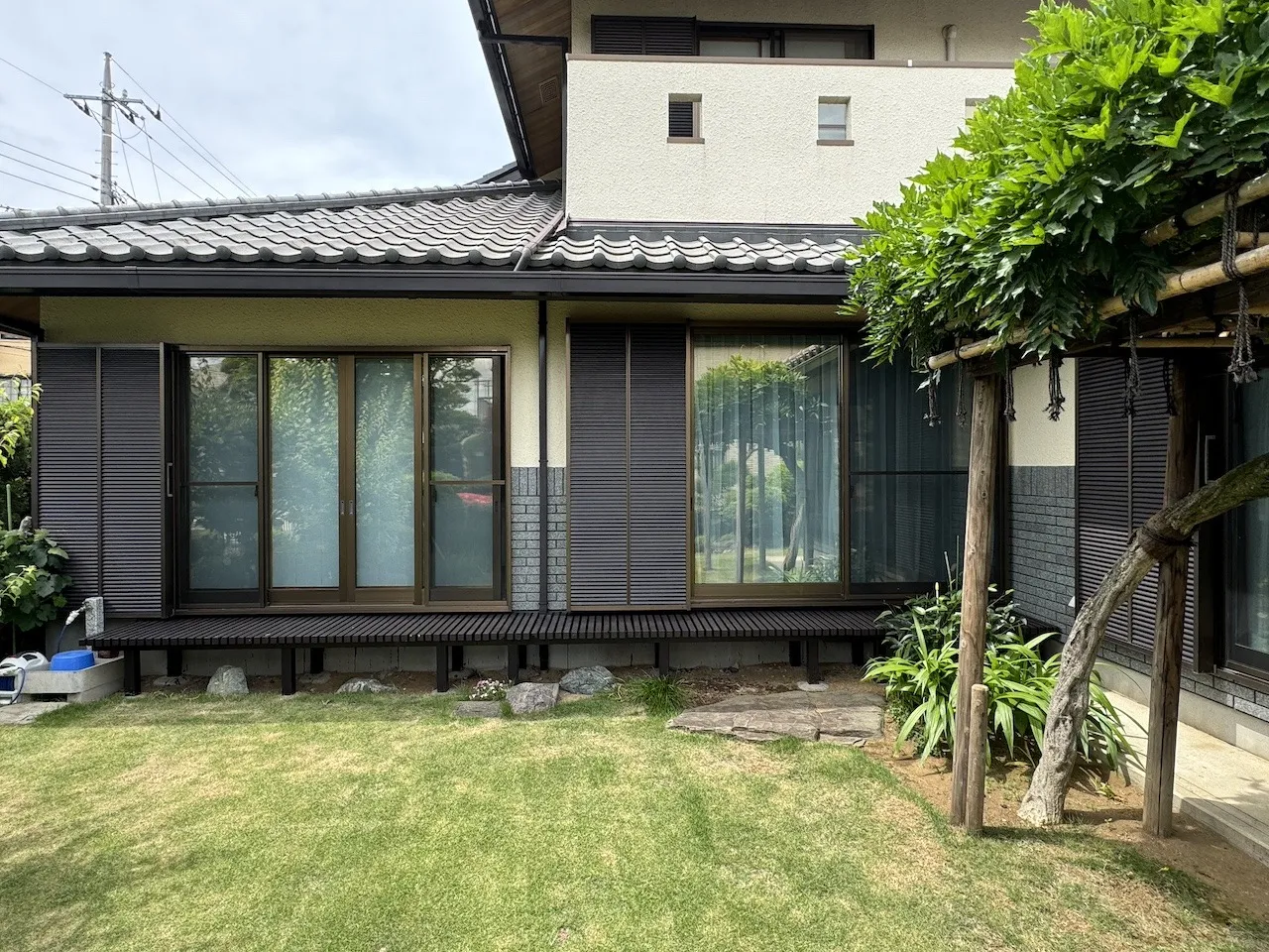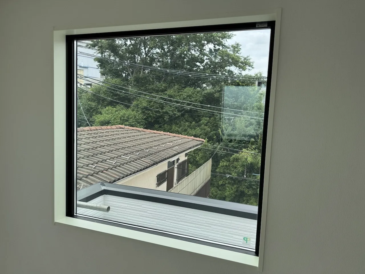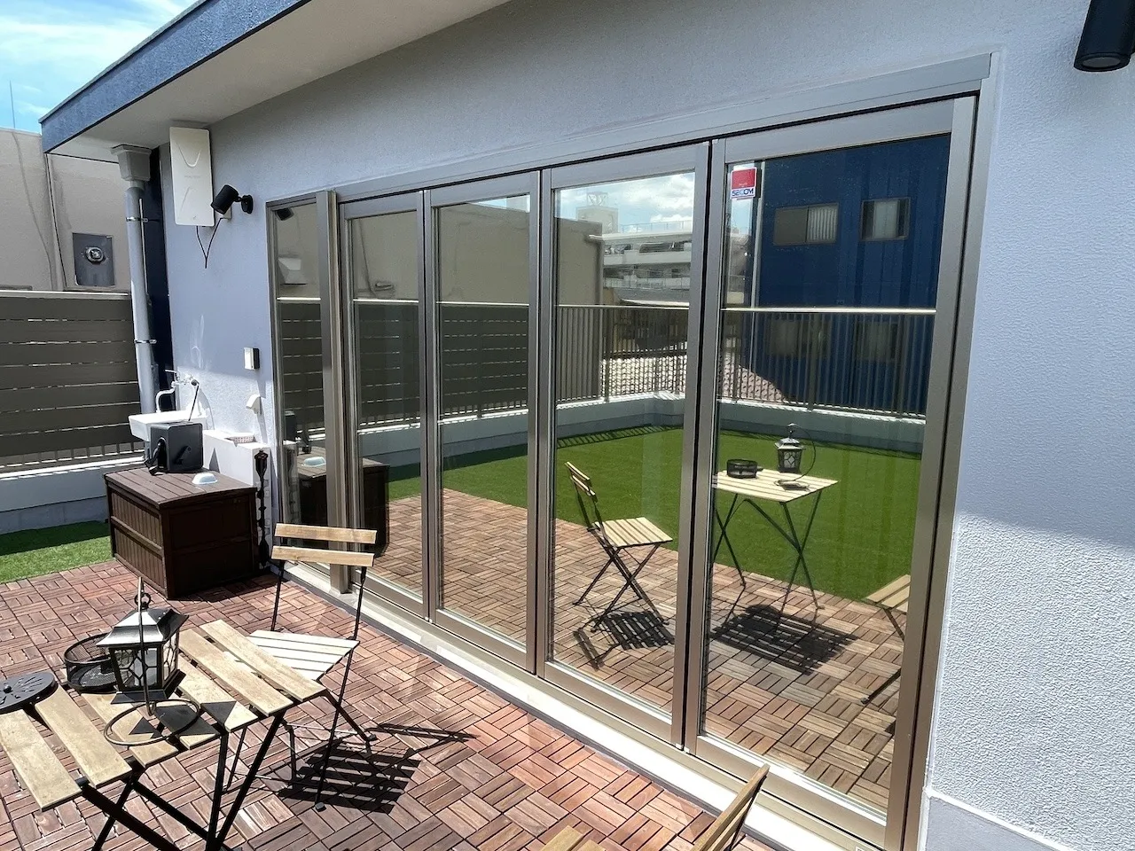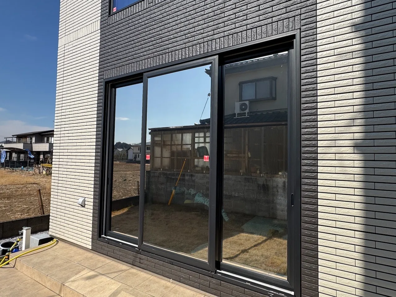 LOW-E複層ガラスの種類やお客様の環境によっては内貼施工ができないことがあります。室内側に防犯フィルムが貼ってある場合やトリプル複層ダブルLOW-Eガラスなどには外貼り用のシルバー遮熱フィルムがおすすめです。内貼り用のシルバー遮熱フィルムと比較すると、やや明るく、やや優しい色合いになります。アンバー35と並んで建物が引き締まって見えて格好良いです。写真はタクミ製RSP15EXで遮蔽係数は0.28になります。