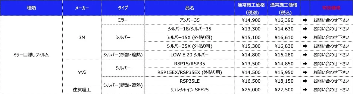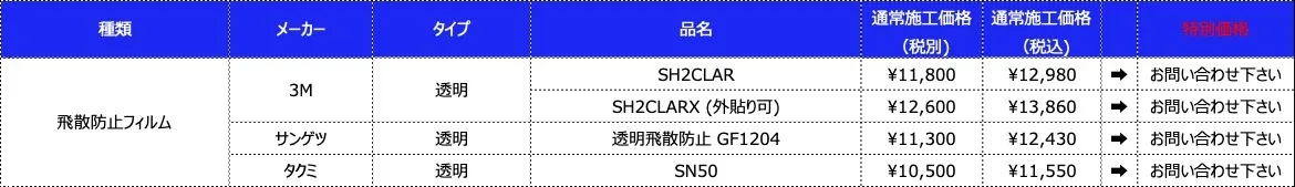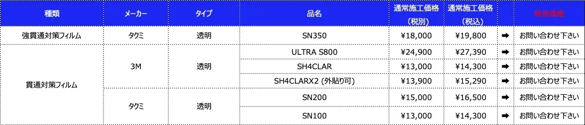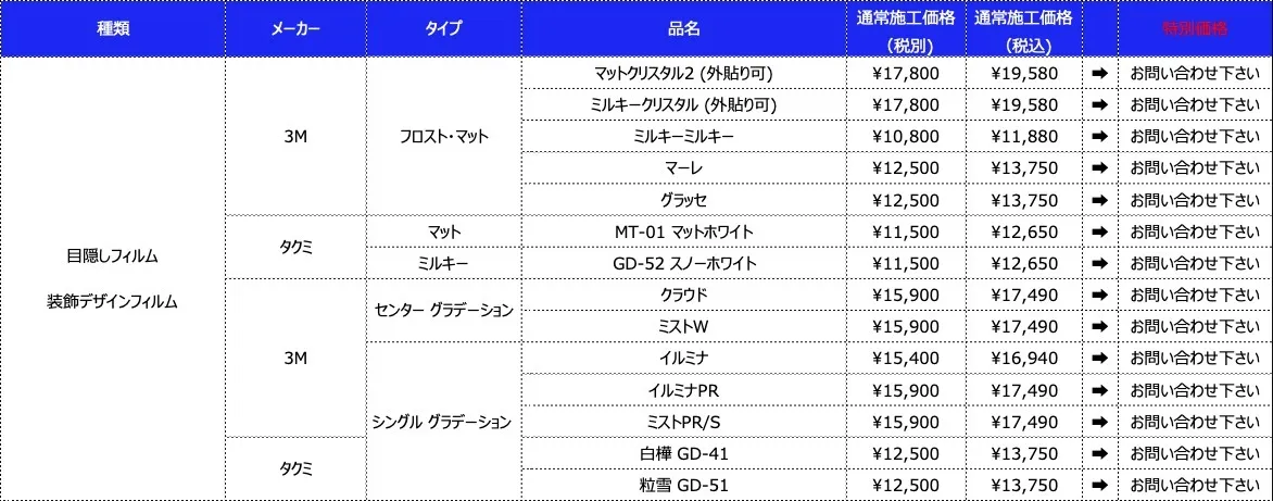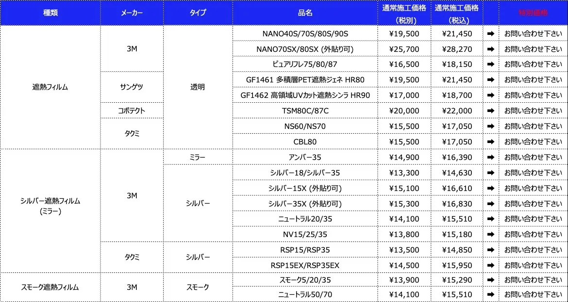 オーエスワークスのフィルムの種類別/メーカー別の施工価格のページです。