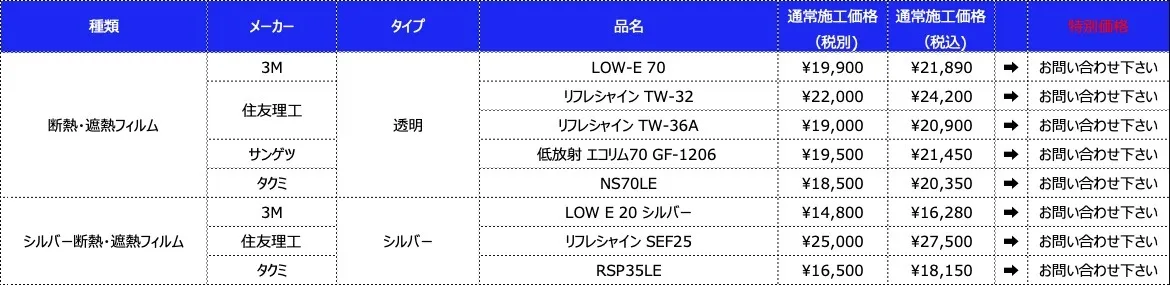 施工にかかる費用について、フィルムごとに一覧でご確認いただけます。施工費用について大まかな金額がご覧いただけますので、ぜひご利用ください。窓の種類や場所によっては、ガラスの熱割れの理由から使用できないフィルムもございます。詳細につきましては、お問い合わせいただいた際にお話しいたします。現地調査・お見積りは無料にて行っておりますので、お気軽にお問い合わせください。
